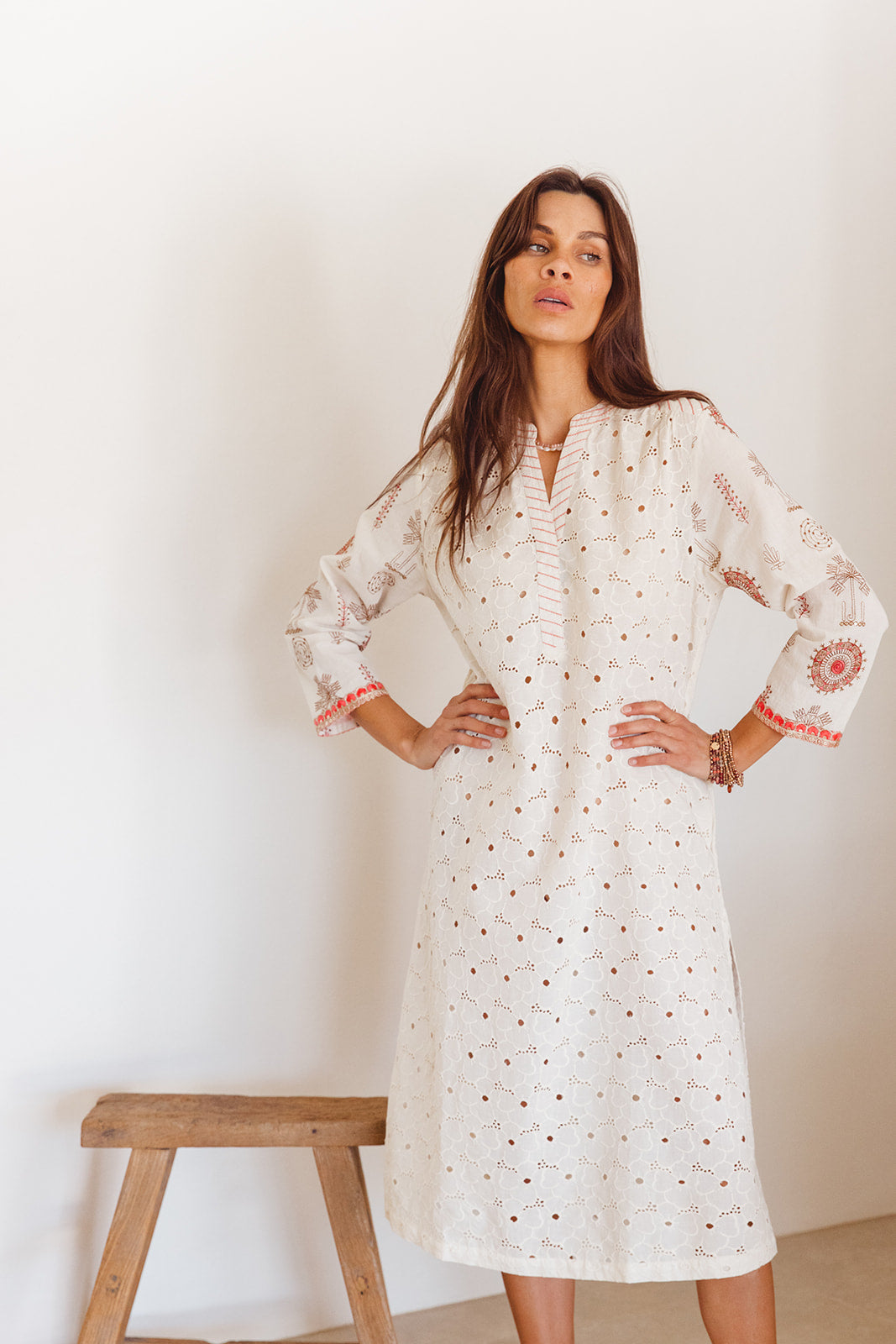 The Biba Dress is crafted from soft cotton eyelet, beautifully detailed with hand-embroidered motifs and contrast thread work that whispers of tradition and modern ease. Its relaxed A-line silhouette and side splits create graceful movement, while the split neckline and ¾ sleeves add an understated elegance. Perfect for barefoot days at home or layered with gold accents for coastal soirées.