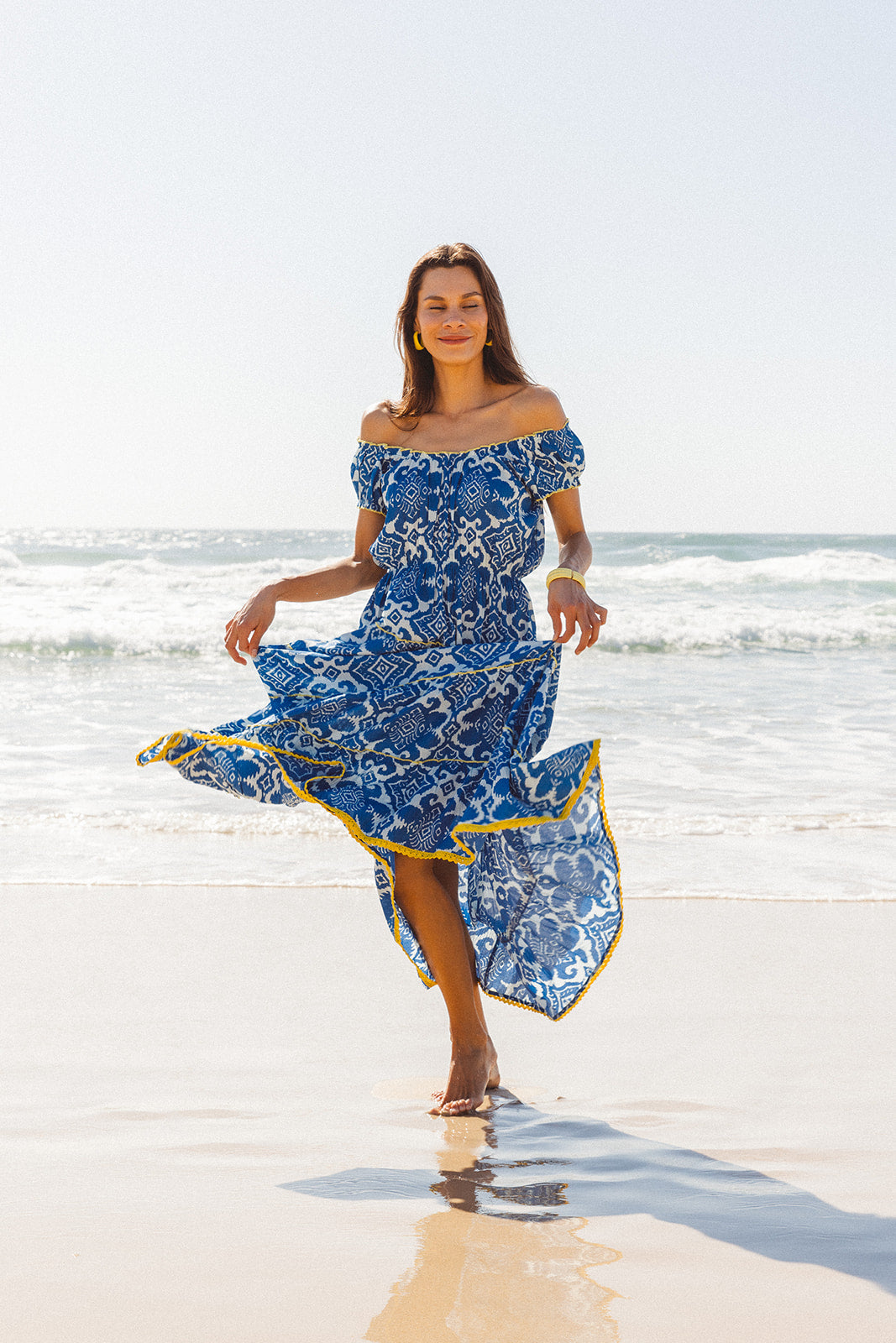 Romance your life in the Paris Maxi. Featuring the Amalfi print in a timeless blue and white palette, finished with playful yellow detailing, she moves beautifully with every step - perfect for beachside escapes and elevated everyday wear.