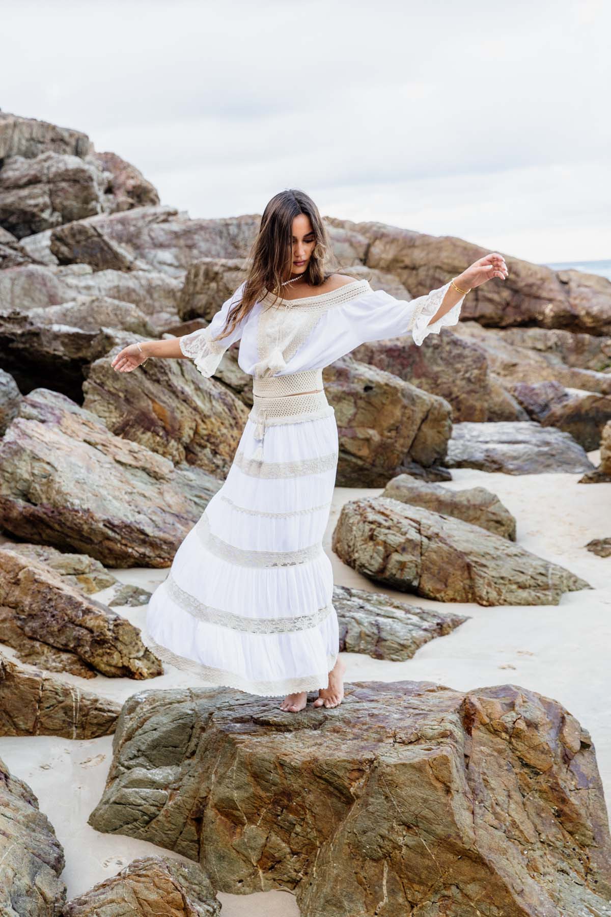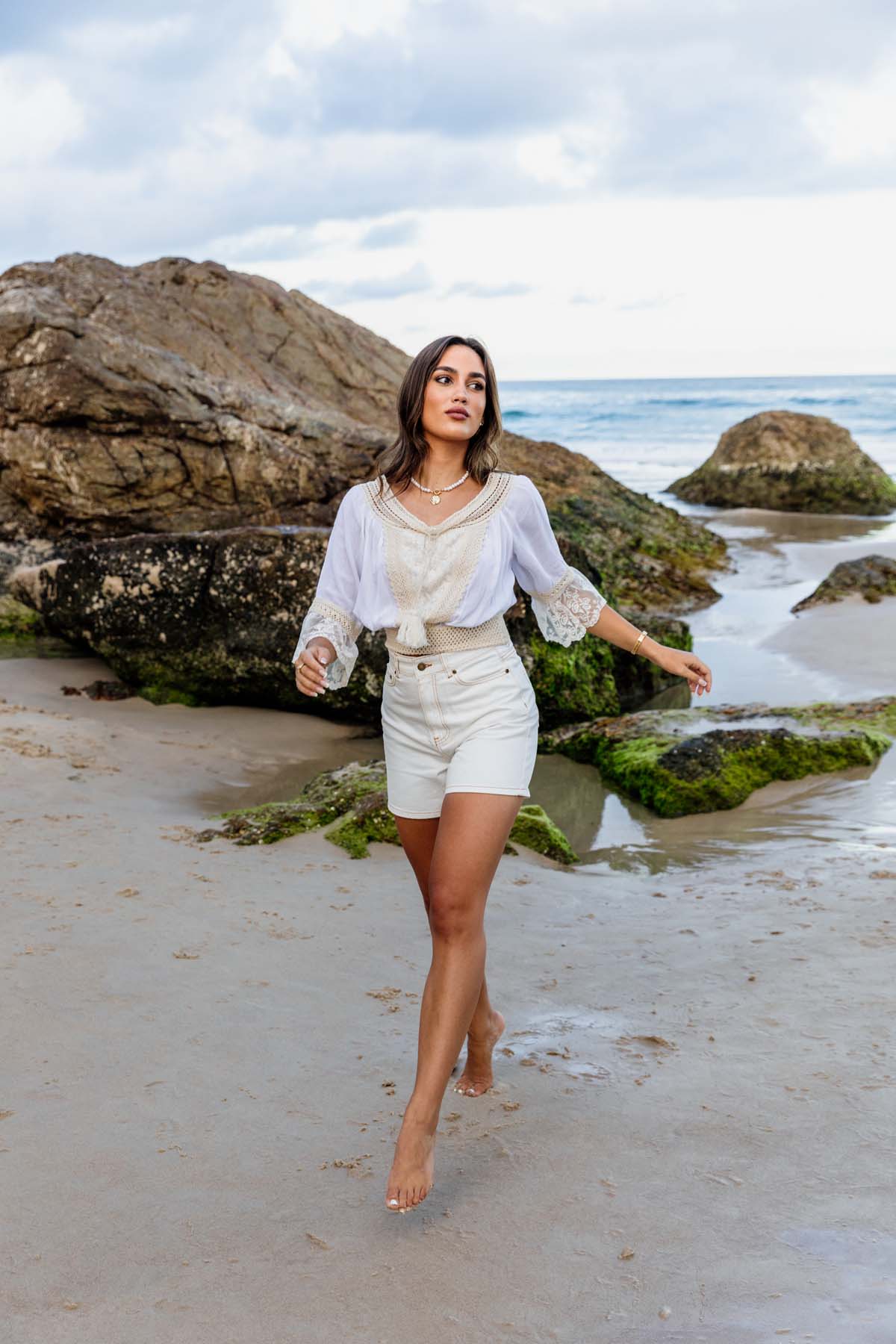 The Valentina top embodies the essence of coastal living and bohemian flair, drawing inspiration from the captivating Spanish silhouette. Its captivating design features a harmonious blend of white and ecru colors, creating a chic and sophisticated combination that complements various styles.
